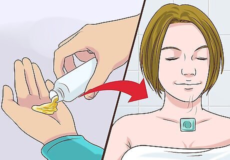 Try topical applications. The most common delivery methods for aromatherapy are topical applications of solutions, such as compresses or massage oils, that include small amounts of essential oils. Mix a few drops of essential oil into a carrier liquid like water or mild cold-pressed oils, and apply it to your skin. The general guidelines for mixing topical solutions is that you should add 1-3 drops of essential oil for each teaspoon of your carrier liquid. Never exceed a 5% concentration of essential oils in your mix. Then, you can either rub your solution directly onto your skin or pour it over a clean towel to apply as a compress. If you’re using an oil for your carrier liquid, it’s best to use ones that aren’t strongly scented, such as jojoba, grapeseed, or avocado oil. If you’re using water, be sure to shake your solution before using it since oil and water do not stay mixed. If you don’t want to mix your own, there are plenty of products that offer pre-made topical solutions, such as massage oils, lotions, and body sprays. Be sure that they have at least a 1% concentration of actual essential oil. This delivery method allows you to inhale the essential oil’s perfume. It is also a useful treatment for acute skin conditions, like minor cuts and burns, since essential oils have antimicrobial properties. Because essential oils can be hazardous to your health or easily cause skin irritations when they’re applied incorrectly or in too great of concentrations, there are some risks associated with topical application methods.