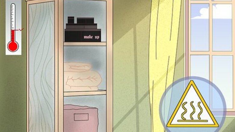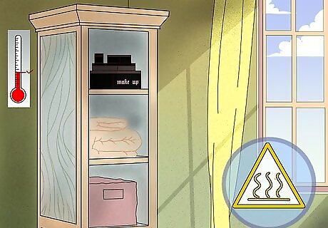 Store makeup in a cool, dry place. Makeup should be stored in an interior closet, such as a linen closet, away from an outside wall. This is because exposure to warmth and sun can dry out the products. Too much warmth can also cause the natural oils to separate from the rest of the product, leading the makeup to expire.