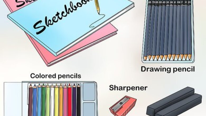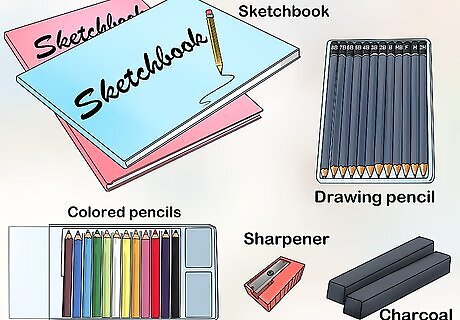 Purchase your sketchbook and drawing materials from an art store. Choose between drawing or sketch paper, and buy at least four to seven different pencils in a varying hardness levels. At a minimum, you should get a rubber eraser and a kneaded eraser. You can also purchase colored pencils and charcoal for other drawing projects. Don’t forget the pencil sharpener! Sketchbooks and drawing pads come in a variety of sizes, and any size will work just fine. Choose a book that works for you. You can get one with an attractive cover or decorate your own! A #2 pencil is an “HB” drawing pencil. For softer, darker marks, use pencils B-9B. For harder, lighter marks, use pencils H-9H. A standard set usually comes with pencils 8B, 7B, 6B, 5B, 4B, 3B, 2B, B, HB, F, H, 2H.
