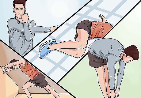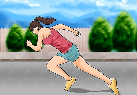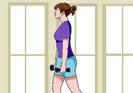 Hold dumbbells while doing lunges to help your thighs and glutes. While standing, hold a dumbbell in each hand. Step forward with 1 leg while keeping the other leg back. As you do this, lower your hips towards the floor. Your knees should be bent at 90-degree angles. Move your legs back into a standing position. Do 2-3 sets of 6-12 repetitions with heavy weights or 2-3 sets of 12-15 reps with light weights.
