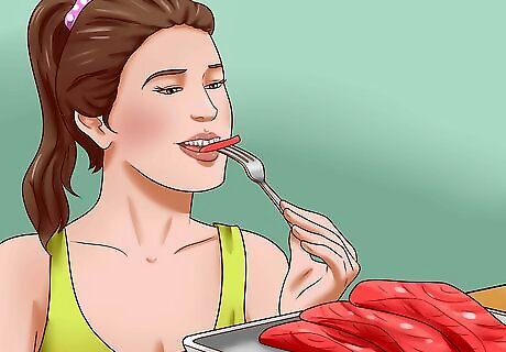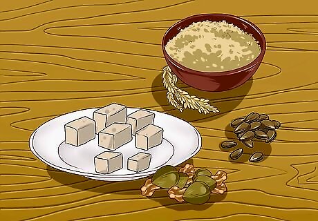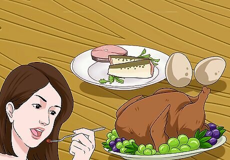 Get enough protein in your diet to support building muscle. Protein can help you build and maintain muscle, but your diet shouldn't be more than 35% protein. You should eat about .37 grams of protein for every 1 pound (0.45 kg) of body weight. Protein-rich foods include eggs, meats, fish, and cottage cheese. For example, you might eat scrambled eggs in the morning, a peanut butter sandwich for lunch, and grilled chicken for dinner.