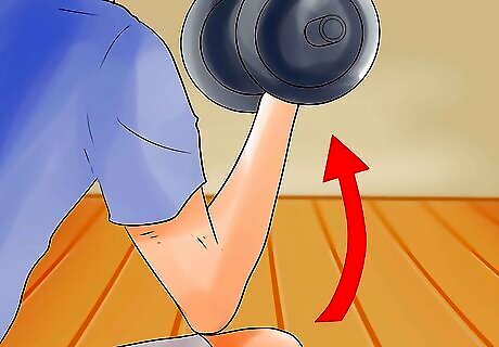 Do a single-arm dumbbell press to work your arms and shoulders. Hold the dumbbell at shoulder height with your arm bent. This is the starting position. Slowly extend your arm up until it is straight. Keep your shoulder down while you do this; do not lift it towards your ear. Hold this pose for a second before slowly lowering it down to starting position. With heavier weights, repeat this exercise 6-12 times on each arm for 2-5 sets. With lighter weights, do 2-3 sets of 12-15 reps for each arm.