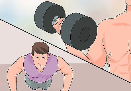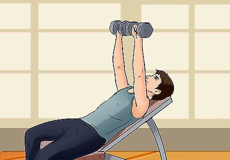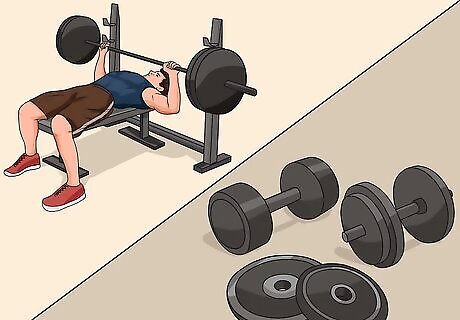Do a bench press to strengthen your chest, front shoulders, and back. Lie back on a bench and position yourself under a racked barbell. Plant your feet flat on the ground. Arch your back slightly to keep a neutral spine. Grip the bar tightly and push up to remove the bar from the rack. Slowly lower the bar towards your chest before pushing up again. Do 2-3 sets of 6-12 repetitions each if you want to build muscle. Aim for 2-3 sets of 12-15 reps if you want to work on endurance.