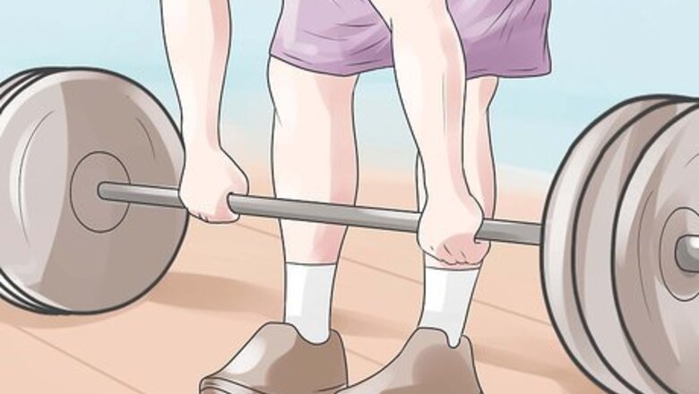 Try deadlifts to exercise your glutes, hamstrings, and quads. Stand straight with your feet slightly apart. Hold a dumbbell in each hand, with your palms facing towards your body. Slightly bend your legs, lowering the weights down in front of your body until they reach your knees. Slowly rise back to a standing position. Do about 2-3 sets of 6-12 reps each if you are using heavier weights and 12-15 repetitions if you are using lighter weights.
