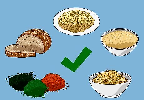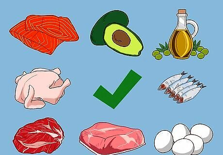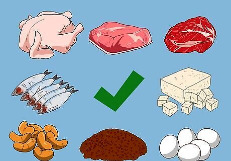 Protein causes carbs to release energy more slowly. As you reduce the amount of carbs you’re eating, increase the amount of protein you consume to help keep your blood sugar down. Eat more beef, chicken, fish, pork, seafood, turkey, beans, cheese, eggs, nuts, tofu, seeds, and low-fat dairy. A good general goal is to eat 1-1.5 grams of protein per 2.2 lb (1.00 kg) of body weight each day. Eating lots of protein also helps you build and maintain lean muscle mass and keep your weight under control. You can also get protein from a whey protein supplement powder, which you mix with water or milk to make a protein shake.