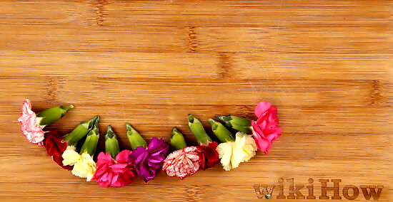 Arrange your flowers in your preferred order. You only need to worry about this if you’re using carnations of different colors. Set them in the order that you’ll want them to be in for your lei. That way, you’ll pick up and thread them in the right order and you’ll be able to work more quickly. For example, if you’re using blue and red carnations and want them to alternate, set them up in an alternating pattern on your table.