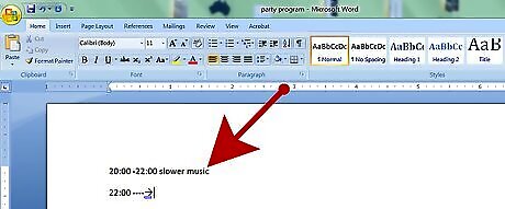 Think about the flow of the party. Most party mixes go one of two ways: loud and fun from start to finish, or spaced out along a set trajectory. Either method is fine, but if you're not going to shuffle, it's best to go with the second option. Generally speaking, you can set the first half hour or so to be a bit quieter and slower, and plan for a similar break a few hours into the mix. The music should still be fun to listen to, but it can ramp up to a higher energy level slowly.
