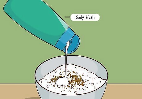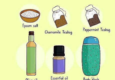 Gather the ingredients. For this mineral bath, you'll need: 2 1/2 cups Epsom salt 1/2 cup olive oil 3/4 cup body wash 1 peppermint teabag 1 chamomile teabag 10 drops of favorite essential oil (e.g., lavender or ylang ylang).