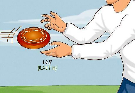 When the disk is 1-2.5 feet (0.3-0.7 meters) in front of you, catch it. It is instinct usually. The basic idea is to close your hands around the disk at the right time and not close your eyes. If the disc is an aerobie then the easiest way to catch it is to stick your arm in the large center hole. For Frisbee the easiest way to catch is the alligator method. Take both hands and clamp them around the disc like an alligator. For a one-handed catch: Keep your thumb pointing up if the disk is coming in below your waist. If the disk is coming in high, keep your thumb pointing down. Use whichever position feels most natural for in-between heights. Squeeze your fingers and thumb tightly together to grab the disk just before it smacks into your palm.