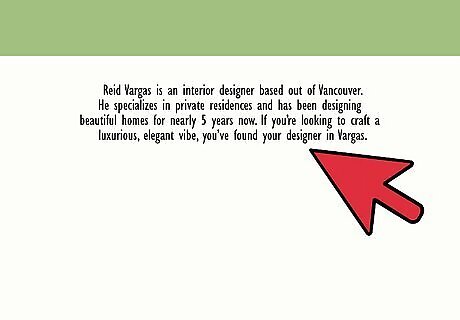 Put an introduction on the home page of the website. Include 3-5 sentences explaining where you’re from, where you work, and what your design philosophy is. Make this the first thing that readers see when they go to your website. Include a photo of yourself next to the text and either put a large photo of your spaces in the background, or in a text box next to the intro. For example, you may write, “Reid Vargas is an interior designer based out of Vancouver. He specializes in private residences and has been designing beautiful homes for nearly 5 years now. If you’re looking to craft a luxurious, elegant vibe, you’ve found your designer in Vargas.”