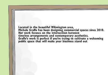 Put a brief introduction on the first page of the portfolio. Write 3-5 sentences describing who you are, where you’re from, and what your general design philosophy is. Emphasize the elements of your work that make you stand out when compared to other interior designers, since that’s what potential clients and employers will be interested in. You can use “I” if you want a more intimate introduction, or refer to yourself in the third person for a more formal option. It’s totally up to you. A solid introduction might start, “Located in the beautiful Wilmington area, Michele Graffo has been designing commercial spaces since 2010. Her work focuses on the intersection between timeless arrangements and contemporary aesthetics. Graffo’s work is perfect if you’re trying to cultivate a welcoming public space that will make your business stand out.”