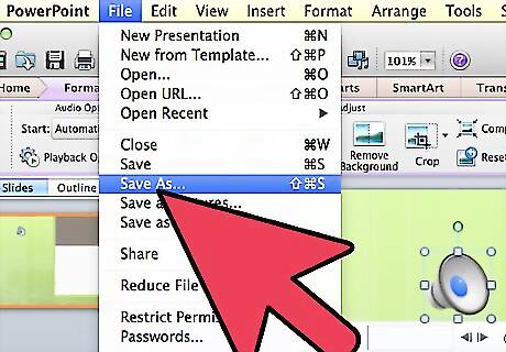 Save your presentation by clicking on File => Save As =>, and then decide where you’d like you file to be saved => Name the File => click Save.