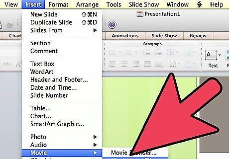 Click on Insert => Movies and Sounds => Movie from file (or Sound from File) to add a video or audio file to your presentation.