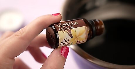 Add fragrance when the wax has cooled to about 120 °F (49 °C). Use fragrance oils (which are synthetic) or essential oils to give your candles a scent. Start with 15-20 drops of essential oil, but keep in mind the fragrance will be milder when the wax hardens. If you add fragrance before the wax has cooled, you run the risk of burning off all the fragrance immediately. Different fragrances have different flash points, but all of them are over 120 °F (49 °C). Go with a mix of lavender and vanilla oils for a simple, relaxing aroma. Citrus scents, such as lemon or orange, tend to be more energizing—for example, lemon and verbena are a popular combination. It takes a little experimentation to get the fragrance just how you like it. Keep a log of how much fragrance you use with each batch of candles you make so you can tweak your formula until you get it right.