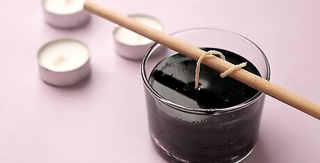 Use candle dye to color your candles. Add a few flakes or a dash of pigment powder to your hot wax and stir until all of the dye is melted and your wax is a consistent color. Continue to add dye until you get the color you want, stirring well. You might've heard that you can melt crayons to color your candles, but this isn't a great idea. Crayons are made from paraffin wax and pigments that can clog the wick and cause smoking and burning issues. Candle dyes might cost a little more than a box of crayons, but your color will be more consistent and your candles will burn cleanly and evenly.