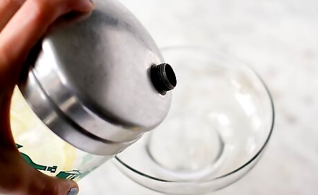 Strain the shaken cocktail into the appropriate glass. Hold your fingers over the strainer while pouring to keep the strainer in the shaker cup. Depending on the cocktail recipe, the drink will be strained into an empty glass or a glass that has been filled with ice. Glasses can be chilled in a freezer or with ice before straining.