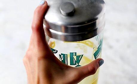 Shake vigorously for about five seconds. Keep the cap held tightly over or in the shaker. Hold the shaker vertically or somewhat tilted and shake it up and down. Hold the shaker securely in a manner that feels relatively comfortable. Some additional movements, such as side to side motions, can be used while shaking the shaker up and down to create some added flair. Use both hands for most shakers, with one hand on the bottom of the shaker and the other on the top. The ingredients need to be chilled thoroughly and totally mixed. When the cocktail is adequately mixed and chilled, condensation should form on the outside of the cocktail shaker, and the shaker will be cold to the touch. When using a Boston shaker, the shaker should be inverted when shaking so that the glass cup is on the top. This will prevent the glass cup from hitting and breaking on an object, and will prevent the ingredients from leaking out of the shaker. The cooling process that occurs during shaking will also cause Boston shakers to form a solid seal between the glass and metal cups (metal contracts on the glass as it cools).