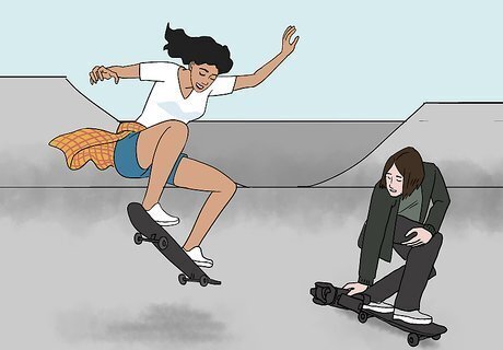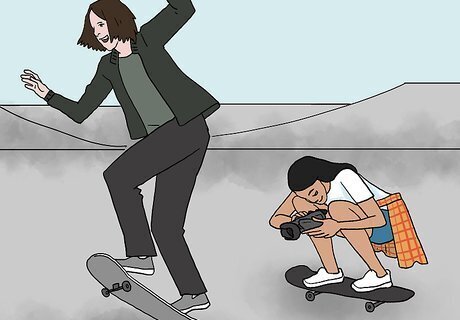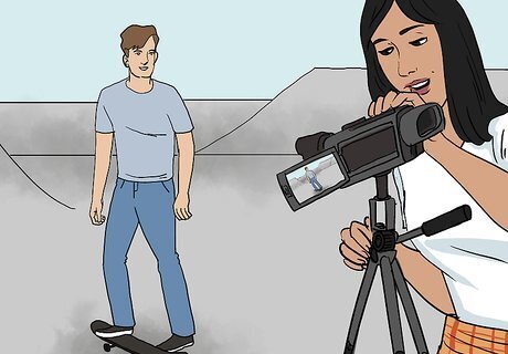 Set up the camera. If you are alone, set up a camera stand filming the area you will be skating. Check to be sure you are completely in the view of the camera by doing a test trick, then reviewing the film.
