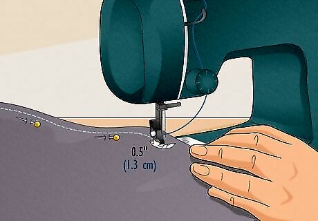 Sew 0.5 in (1.3 cm) from each of the pinned edges. Select the straight stitch setting on your sewing machine. Begin sewing at the corner of 1 of the pinned and unpinned edges. Then, sew all the way around the pinned edges of the blanket. Make sure to leave 1 of the edges of the blanket open. This is essential to put the poly pellets into the blanket. Remove the pins as you sew. Make sure not to sew over the pins since this may damage your sewing machine.