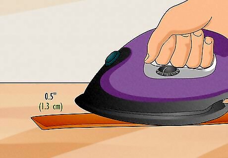 Fold over each of the edges of the strips by 0.5 in (1.3 cm). If you are making your own binding, then fold the fabric over at the edges by 0.5 in (1.3 cm) and iron along the folded edges to crease them. Make sure to do this for the short edges as well so that they will not have any raw edges. If you are using pre-cut blanket binding, then the edges may already be creased. Make sure that the raw edges are tucked under so that they will be hidden when you apply the binding to the edges of the blanket.