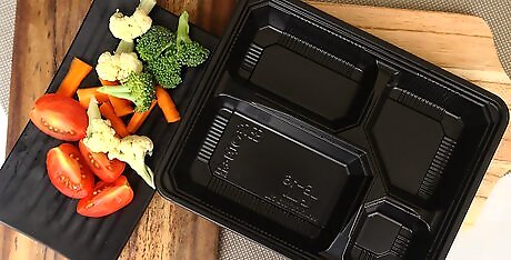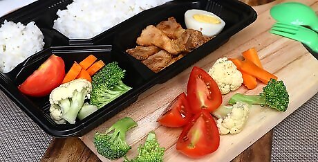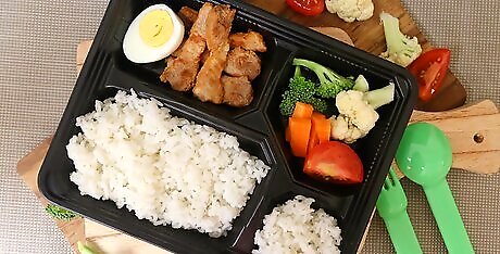 Buy a traditional bento box with separate compartments. Bento boxes come with compartmentalized sections that easily keep your portioned foods separate from one another. They can also help you fit your meal into a fairly compact space, making it easier to carry with you to work or school. Aim for a box with 4 separate compartments, but feel free to experiment. Bento boxes come in a variety of sizes and may also include separate tiers, so choose the size that best suits your needs. If you plan on heating up your food, confirm that the box is made of microwave-safe material. If you don’t want to buy something new, you can always use a regular lunch box with small airtight containers to keep the food separated. If you’re buying a bento box for a child, look for something cute with fun colors, anime characters, or a kawaii vibe.