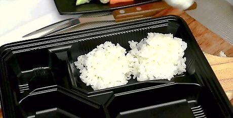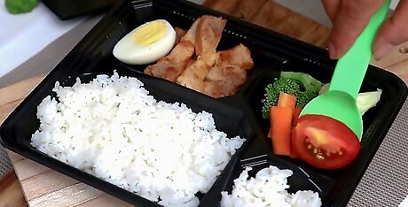 Use rice or another carbohydrate to make up 50% of the meal. Traditionally, rice serves as half of the meal in a bento box, but you can use any kind of starch you want. Go with healthy, filling carbohydrates like rice, whole grains, potatoes, pita chips, wraps, or sandwiches. You can spoon rice directly into the compartment in the bento box or use an ice cream scoop to make rice balls for a nicer presentation. Feel free to play around with this ratio, especially if you’re watching your carbs. Consider daily activity when creating the main portion of the meal. A teenager who plays sports may need more carbs than an adult with a desk job.