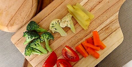 Finish with 25% vegetables and fruits. You can go with 1 vegetable as an additional side portion and include 1 fruit as the dessert, or you can use all veggies or all fruit to make up the remaining quarter of your bento box. Cherry tomatoes, carrot sticks, and cucumber slices are super portable veggie options. For fruit, try orange slices, mixed berries, or apple slices. Cut fruit and vegetables into shapes like stars, hearts, and diamonds with cookie cutters. To sweeten things up, drizzle honey over your favorite fruits.