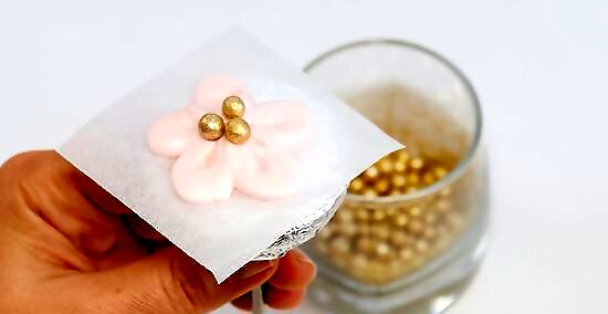 Add the stamen. Use cake decorating tweezers to place three yellow sugar pearls in the center of the flowers. You can also use a tiny round tip (ie: Wilton 1) and dark pink icing to make 3 to 5 dots instead. Make sure that the pears/dots are not touching.