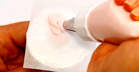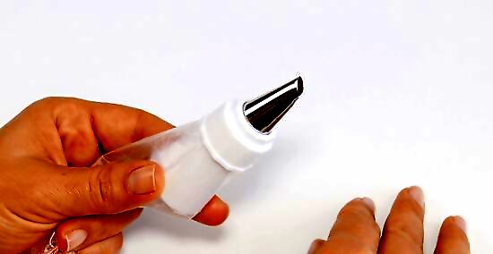 Start making your first petal. Hold the bag so that the tip is at a 45-degree angle to nail head. Make sure that the narrower side of the tip is facing up. Using a medium amount of pressure, gently squeeze the bag while turning the nail by 1/5.