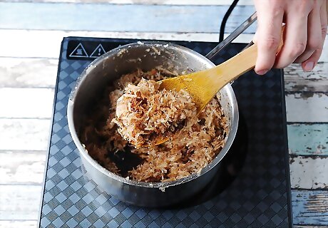 Keep stirring until the coconut pieces start to brown. As the sugar caramelizes, the coconut mixture will start to stick together and the coconut pieces will turn brown. Once this happens, take the saucepan off the heat and spoon the coconut mixture onto a plate. Be careful not to touch the coconut, as it will be extremely hot! Once the coconut has cooled, you can serve it as a dessert or keep it for a sticky sweet snack.