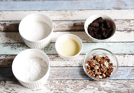 Gather your ingredients. To make these chocolate-covered coconut candies, you will need: 1 3/4 cups of confectioners' sugar 1 3/4 cups of shredded coconut 1 cup of chopped almonds 1/2 cup of sweetened condensed milk 2 cups of semisweet chocolate chips