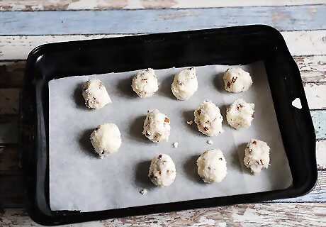 Combine the coconut, almonds, sugar and milk. Combine these ingredients in a large bowl until they form a sticky mixture. Use your hands to divide the mixture into 1 inch (2.5 cm) balls, then place them on a greased cookie sheet and leave to chill in the refrigerator for approximately 20 minutes.