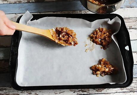 Spoon the mixture onto a baking sheet. Once the sugar has caramelized nicely and the mixture becomes very difficult to stir, turn the heat down to the lowest setting. Working quickly, spoon drops of the mixture onto a baking sheet lined with waxed paper, using about two tablespoons of mixture per coconut drop. Allow the drops to cool and harden before eating.