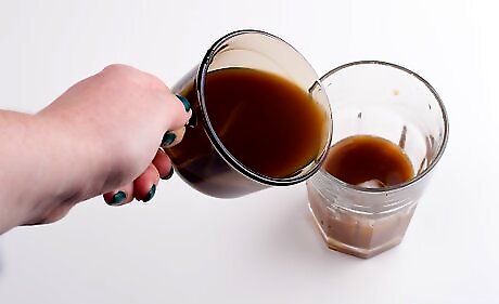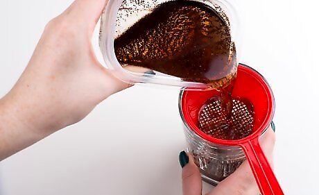 Strain your coffee. Before you can drink your coffee, you’ll need to strain out the grounds. You can do this a few different ways. Of course, you can strain it through a coffee filter, but you can also strain it through several layers of cheesecloth. Pour it through your filter into another container, like a large jar, bottle, or pitcher. Take your time with this step to ensure that you don’t have a grainy drink! You will have five cups of cold brew coffee, so you can make multiple coffee sodas.