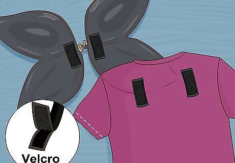 Attach with hook-and-loop fastener. Two strips of hook-and-loop fastener are enough to secure the wings. The sticky sides of the hook-and-loop fastener attach to the inner side of the wings and to the back of your clothes. To put the wings on, push the hook-and-loop fastener sides together and you're done. Arm or thumb loops can be sewn onto felt-covered cardboard. Wrap the material around the wearer's shoulder or thumb to measure the material needed. Hold the material in loops on the wings, then use pins or a sewing needle to bind them together and to the wings.