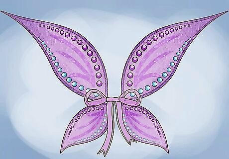 Decorate. The wings can be customized as you please. One way to do this is to add a flower or puff from a craft store by sewing it or attaching it with a hot glue gun onto the knot where the wings meet. The knot may also look good in spray painted duct tape. Children can help with decorating by adding material such as plastic jewels or glitter.