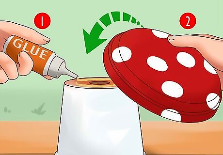 Assemble the mushroom. Turn the pot upside down so that the bottom is sticking up. Coat it with epoxy or waterproof outdoor glue. Place the plate, painted side up, down on top of it. Make sure that it is centered.