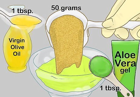 Prepare a simple scrub. Mix together ¼ cup (50 grams) of brown sugar, 1 tablespoon (15 milliliters) of extra virgin olive oil, and 1 tablespoon of aloe vera gel. If you have sensitive or dry skin, try ground oatmeal instead of brown sugar. For a more complex, skin brightening scrub, mix together: 4 teaspoons milk, 1 teaspoon rice flour, 1 teaspoon lemon juice, and 1 teaspoon aloe vera gel. Avoid using white or granulated sugar. The granules are larger than brown sugar and much too harsh for the delicate skin on the face.