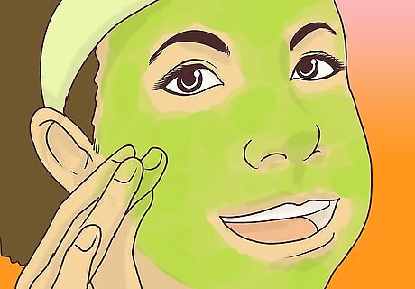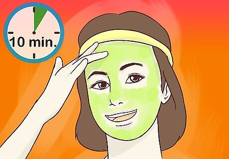 Apply the mask to your face with your fingers. For a more luxurious treatment, use a clean foundation brush to apply the mask instead. Spread it across your cheeks and forehead, and down your nose. Guide it along your jaw line and across your chin. Take care to avoid your lips and eyes. This mask can get messy. Tie your hair back and drape a towel over your shoulders.