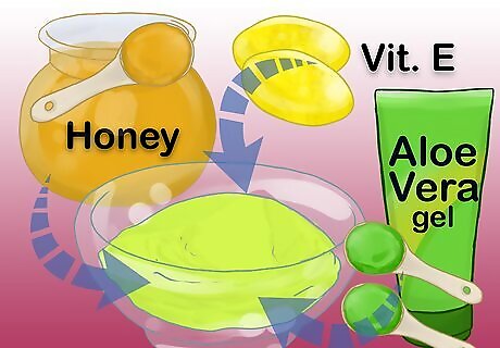 Prepare a simple massage cream. Mix together 2 teaspoons aloe vera gel and 1 teaspoon honey. Break open 2 vitamin E capsules, and stir them into the cream as well. For a lightening cream, mix together 1 tablespoon (15 milliliters) aloe vera gel, ½ tablespoon (11 grams) honey, and 2 to 3 pinches of tumeric instead.