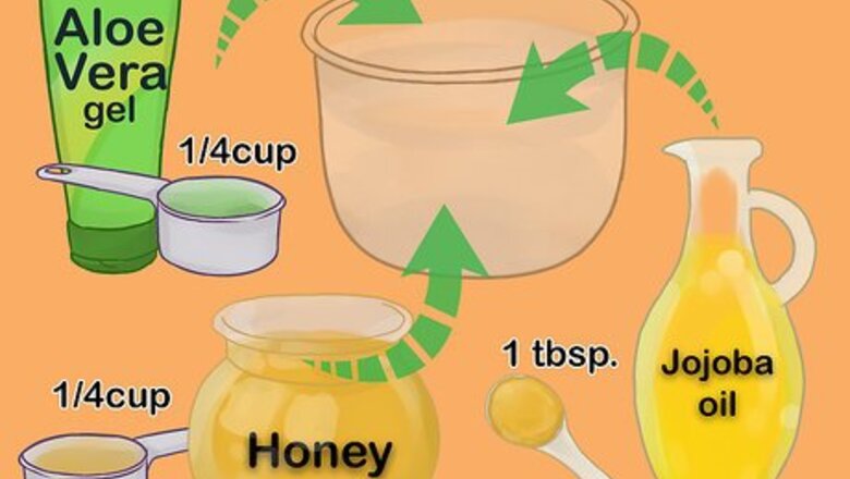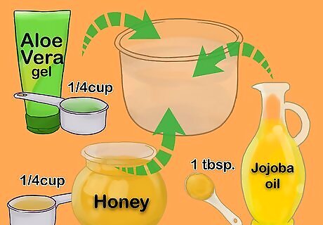 Make a cleanser. Mix together ¼ cup (60 milliliters) aloe vera gel, ¼ cup (90 grams) honey, and 1 tablespoon (15 milliliters) of extra virgin olive oil or jojoba oil. This will give you a moisturizing, hydrating, and antibacterial cleanser. Pour the cleanser into a jar. Store any leftovers in the fridge. You can use simple rose water, or a store-bought cleanser. You can also make a simple cleanser using 2 teaspoons of aloe vera gel and 1 teaspoon of glycerin instead.