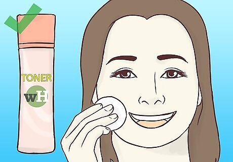 Apply toner with a cotton pad. You can use your favorite facial toner or rose water. You can also mix together some rosewater and aloe vera gel, and apply that to your face; it will act as both a toner and moisturizer. Rose water is a great, natural toner. It helps balance your skin's pH and is suitable for skin conditions, such as dermatitis and eczema.