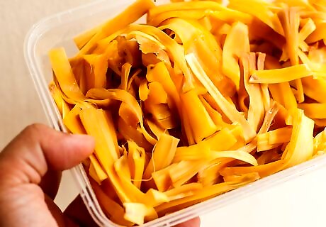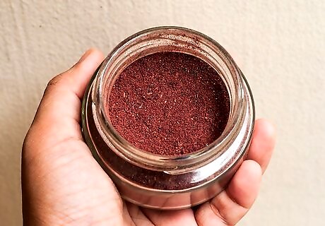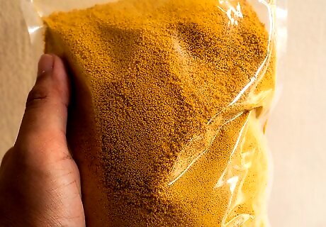 Select foods that are already in powder form. Many vegetables/herbs can be purchased in dried, powdered form, which eliminates the need to do the drying and grinding yourself. Just be sure to select those without added spices or flavoring so you don't influence the flavor of the food you wish to color. If you are not worried about watering down your food, you can mix the powder into a small amount of water or other liquid and then stir this into the food. Do this gradually to achieve the right color and avoid over-saturating your food. For yellow dye, use stale turmeric. Turmeric is often used to give vegan puddings and tofu scrambles their "eggy," yolk-like shade. Stale turmeric tends to have lost quite a bit of its natural flavor, so use this to avoid influencing the taste of your colored food.