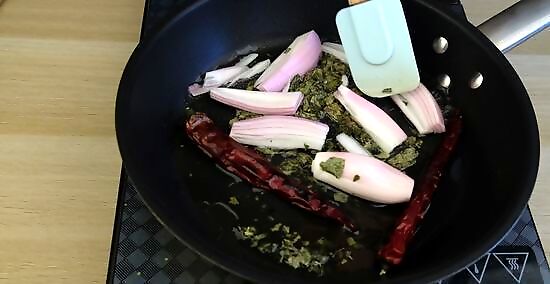 Put the urad dal, 3 of the chilies, 15 curry leaves, and peppercorns into a skillet. Place a heavy skillet on the stove and put 2 teaspoons (5 g) of urad dal into it along with 15 of the fresh curry leaves. Add 3 of the long dry chilies and 1 teaspoon (3 g) of whole black peppercorns. These spices are the basis for your masala. To make your chettinad potato fry less spicy, scrape the seeds from the chilies and discard them.