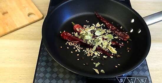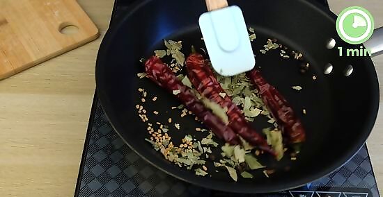 Toast the spices over medium heat for 1 to 2 minutes. Carefully shake the skillet as the spices cook so they heat evenly and don't burn in spots. Cook the spices until the urad dal turns brown and you can smell the spices. Don't walk away from the spices as they're toasting since they can burn quickly.