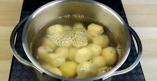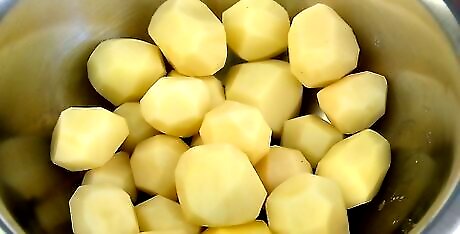 Bring the potatoes to a boil over medium-high heat for 8 to 10 minutes. Transfer the whole potatoes to a pot and pour in enough cold water to cover the potatoes by 1 inch (2.5 cm). Set the pot on the stove and turn the burner to medium-high so the water comes to a boil. Boil the potatoes for 8 to 10 minutes or until they're just becoming tender. You can skip this step if you don't want to parboil the potatoes, but they'll take longer to fry.
