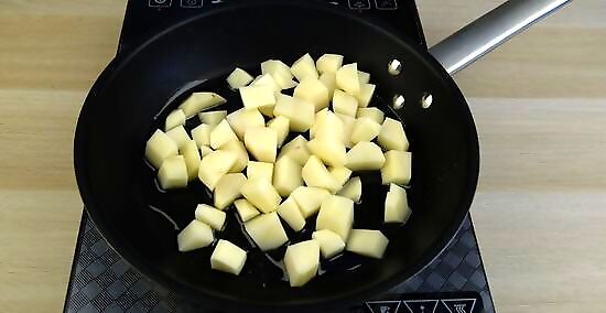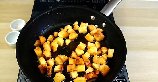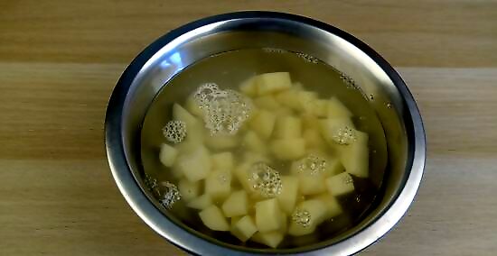 Soak the potatoes in a bowl of cold water for 5 minutes. Transfer the potato cubes to a bowl and fill it with cold tap water so the potatoes are completely submerged. Set the potatoes aside to soak while you heat oil in a skillet. Soaking the potatoes gets rid of some of the starch so the potatoes don't stick together when they cook. They'll also crisp up more than if you skip the soaking step.