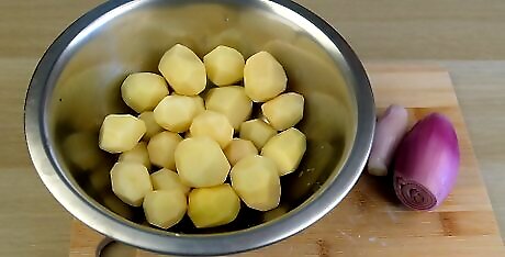 Peel the potatoes and shallots. Rinse 3/4 pound (300 g) of baby potatoes and use a vegetable peeler to remove the skins. Then, peel 1 1/2 cups (150 g) of shallots. Leave the baby potatoes and shallots whole. Shallots are also called sambar onions. They'll give the potatoes a deeper flavor as they fry together.