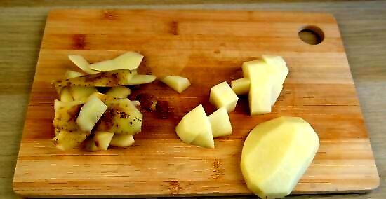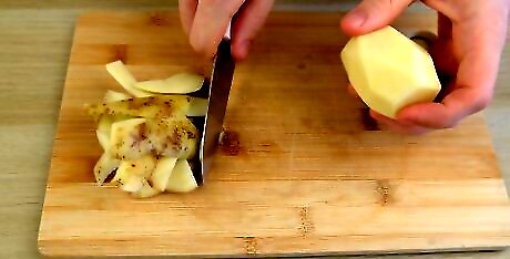 Cut the potatoes into ⁄2 inch (1.3 cm) cubes. Carefully use a sharp knife to cut the potatoes in half lengthwise. Lay them flat so you can cut them into ⁄2 inch (1.3 cm) thick slices. Then, cut across the slices to make ⁄2 inch (1.3 cm) cubes.