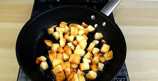 Stir the potatoes occasionally and fry them for 12 to 15 minutes. Stir the potatoes in the skillet so they're coated with the oil and leave them to cook undisturbed for a few minutes. This helps them brown on the bottom. Then, stir the potatoes every few minutes and fry them until they're golden on all sides. This should take about 12 to 15 minutes. You can test if the potatoes are done cooking by inserting a fork through 1 of the cubes. It should be easy to pull the fork back out if the center is tender.